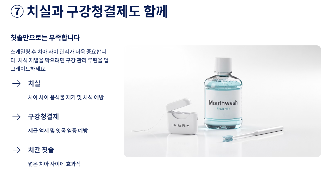 스케일링 이후에는 치아 사이 관리가 더욱 중요합니다. 치실이나 구강청결제를 함께 사용하면 치석 재발을 예방할 수 있습니다.