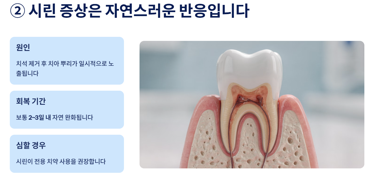 스케일링 후 치아가 시린 느낌은 흔한 현상입니다. 이는 치석이 제거되면서 치아 뿌리가 노출되기 때문인데, 보통 2~3일 내로 완화됩니다. 너무 심할 경우 시린이 전용 치약 사용을 권장합니다.